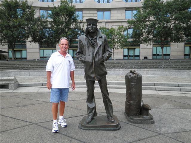 Walt Stinner stands by the "Lone Sailor" in Washington D.C.